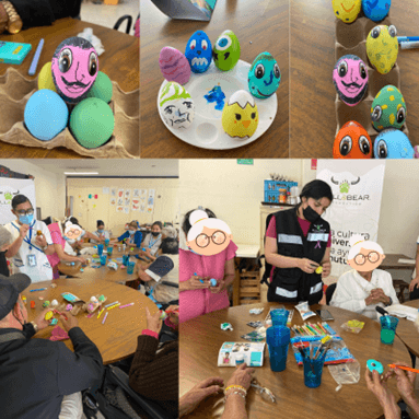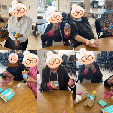 El 12 de marzo de 2024, nuestro taller fue titulado “Huevos de pascua”, en el cuál a través de la pintura y la decoración cada abuelito y abuelita diseño su propio huevo. El objetivo de este taller fue trabajar su motricidad fina en un ambiente sano y recreativo.